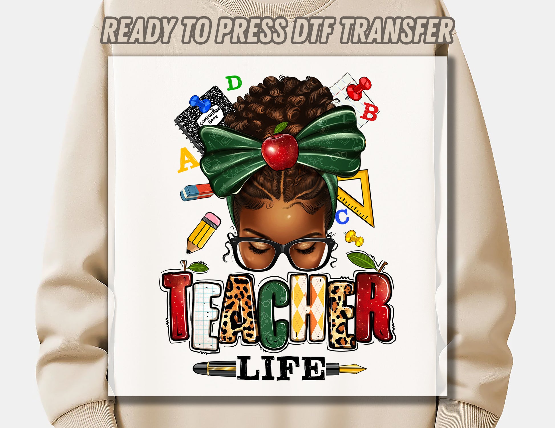 Afro messy bun Teacher Life DTF Transfer ready for press